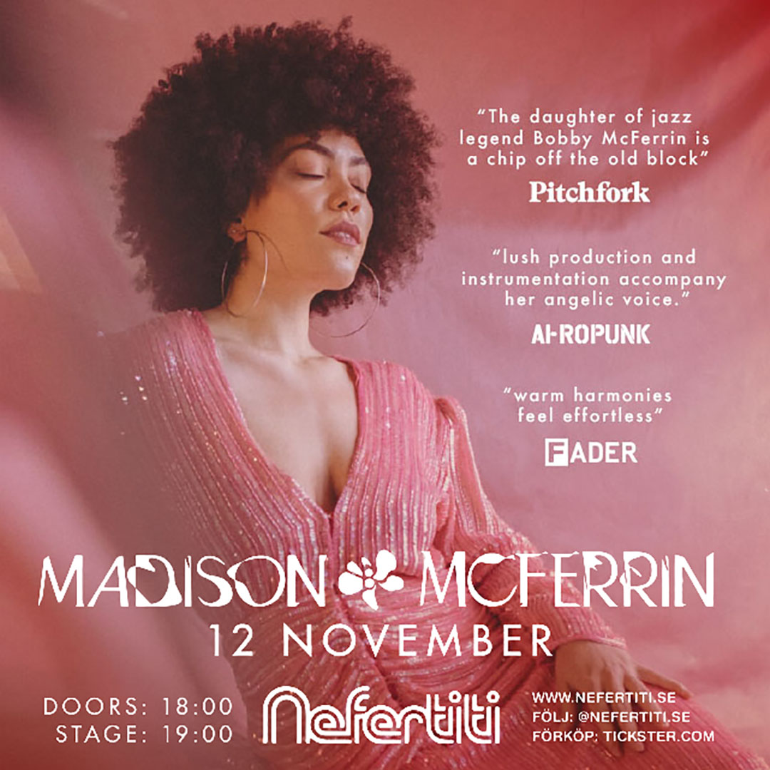 Madison McFerrin, omskriven independent singer-songwriter från Brooklyn, NY, kommer till Nefertiti med sin hänförande soul. Hennes kritikerrosade a capella EP-serie ”Founding Foundations” från 2016 fick tidigt självaste Questlove att namnge en helt egen genre åt henne kallad ”soul acapella”. Även världskända tastemakern och djn Gilles Peterson har hyllat Madison och inkluderat spår från henne i sina legendariska Brownswood Bubblers-samlingar. Efter utmärkelser i Pitchfork som den hetaste nykomlingen för en handfull år sedan, och efter att ha debuterat live under SXSW 2018, har hon fortsatt att trollbinda publikskaror runt om i världen. Madisons uppföljare You + I EP expanderade hennes sound genom att para ihop hennes tidlösa sång med modern produktion från hennes bror Taylor McFerrin (båda barn till legendariska vokalisten Bobby McFerrin). Det visade sig vara en väldigt lyckad kombination och singeln ”TRY” från släppet har i sin live-version för välkända kanalen COLORS samlat på sig över 2 miljoner views. Trots inställda både US- och världsturnéer till följd av pandemin har Madison fortsatt att löpande skapa ny musik under karantänen som hon längtat efter att nu få dela med oss alla. Vi är oerhört glada och stolta över att bjuda in er till vad som alldeles säkert kommer att bli en lysande kväll i höstmörkret.