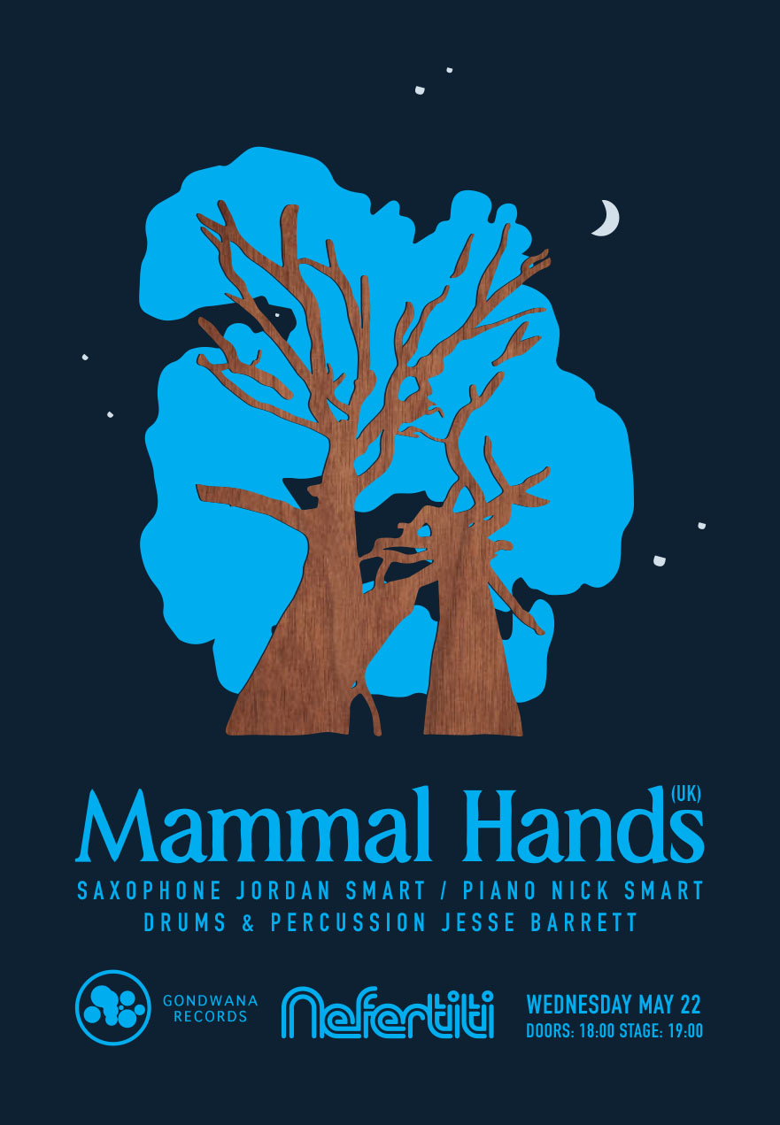 Äntligen får vi se den hyllade trion ’Mammal Hands’ på Nefertiti! Gripande, eteriskt, majestätiskt är beskrivningar vi ofta hör när någon talar om bandet och dess uppfriskande egna sound som fångat lyssnarskaror från vitt skilda genrer. Med sin kärlek för elektronisk musik, modern klassisk musik, folk och jazz med i bagaget skapar trion både medryckande och hypnotiska ljudlandskap. Kompositioner som bär spår av storheter som exempelvis Pharoah Sanders, Gétachèw Mekurya, Terry Riley, Steve Reich and Philip Glass men på ett helt nytt och unikt vis.