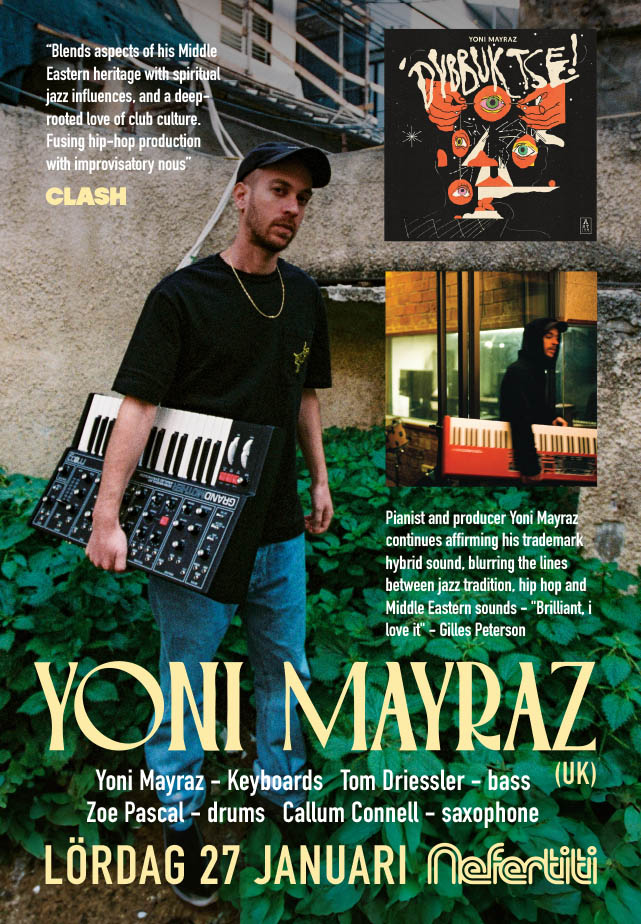 Yoni Mayraz, det senaste stjärnskottet på den moderna jazzscenen, intar Nefertiti. Nära den heliga Herbie Hancock-graalen, menar engelska UK Vibe om London-baserade jazzkeyboardisten och producentens debutplatta ’Dybbuk Tse!’ som släpptes i år. Andra jämförelser brukar vara Yussef Dayes, Ezra Collective men även svenska Oddjob.
